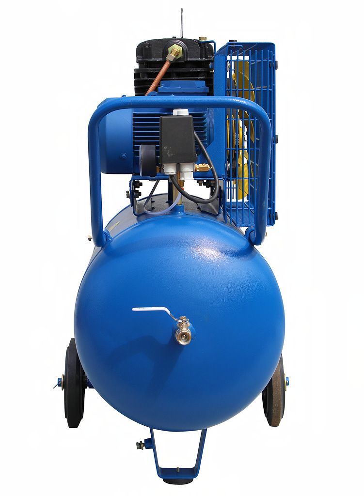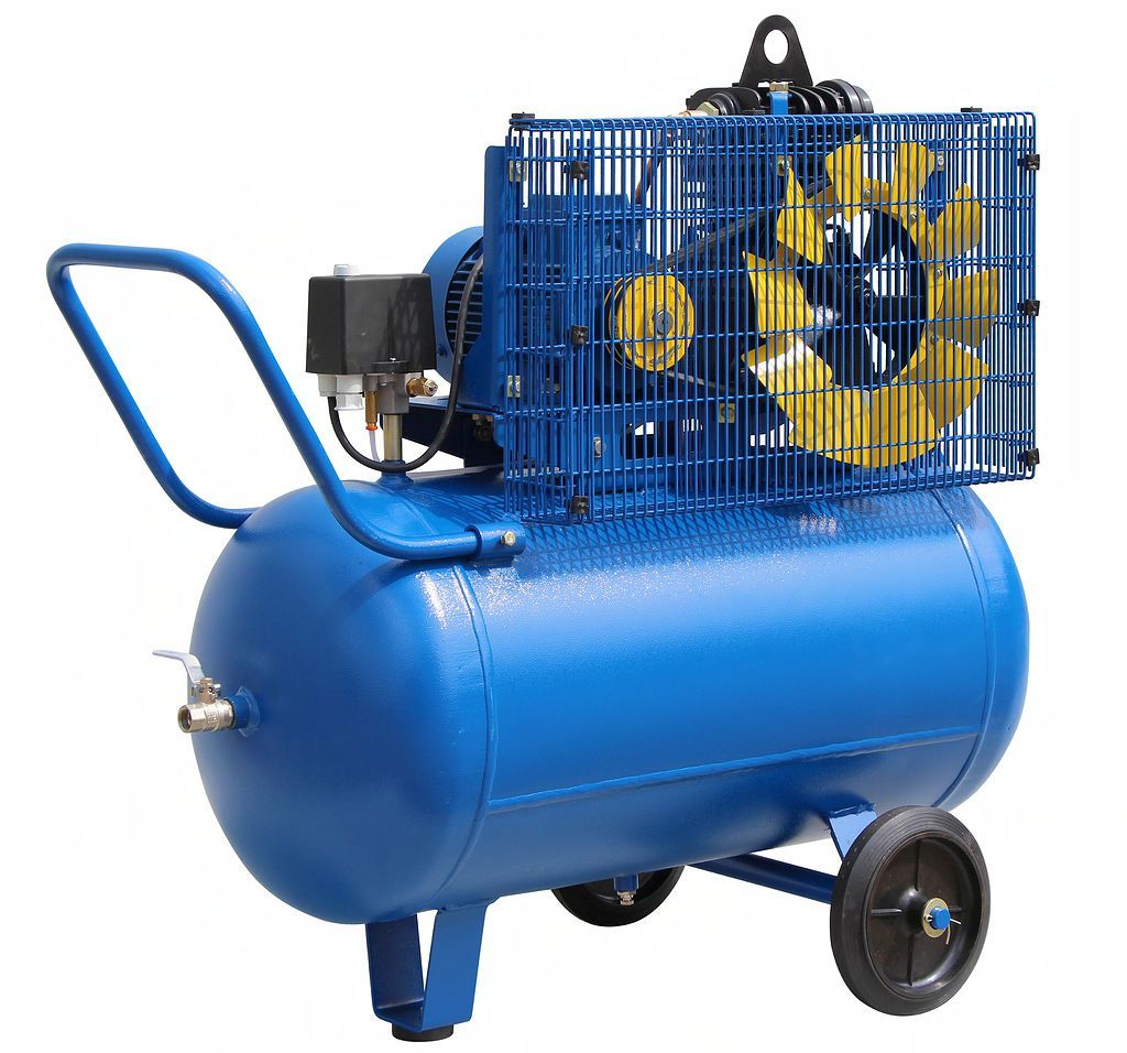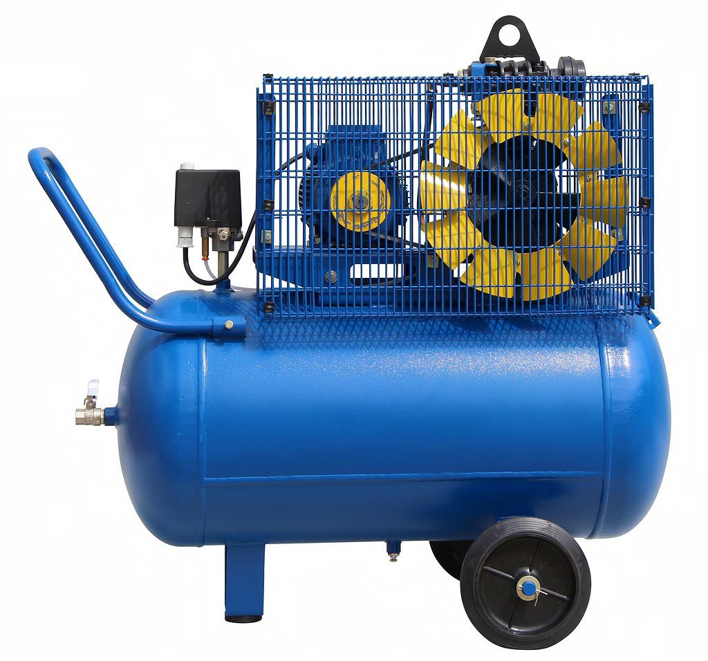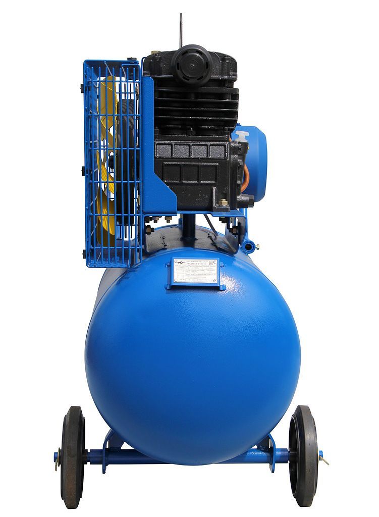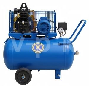 Компрессор К1/10 оснащен ременным приводом, двигатель мощностью 2,2 кВт работает от трехфазной сети напряжением 380В. Максимальное рабочее давление 10 атм., производительность 360 л/мин. На выходе производительность компрессора составляет 275 л/мин.