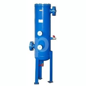 Сжатый воздух поступает через патрубок «вход» в нижнюю часть корпуса фильтра, где происходит механическое отделение (сепарация) наиболее крупных капель жидкости и твёрдых частиц методом инерционного сепарирования центробежным способом. Отделившаяся жидкость (водо-масляная эмульсия) стекает по стенкам корпуса фильтра в днище корпуса.