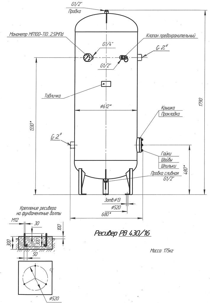Конструкция ресивера РВ 430/10 обеспечивает возможность проведения технического освидетельствования, обслуживания, ремонта, контроля состояния отдельных узлов и соединений. Манометр позволяет контролировать давление при обслуживании, а предохранительный клапан обеспечивает дополнительную безопасность эксплуатации. Благодаря высокому качеству материалов и подтвержденной расчетами прочности, ресивер может эксплуатироваться с заданными рабочими характеристиками в течение всего срока службы. Наружное покрытие - полиэфирная порошковая краска RAL 5010. Расчетный срок службы 10 лет. Расчетное число циклов нагружения 4,9 х 104.